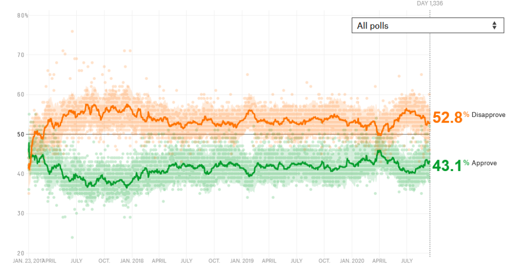 While I fully agree that we would like to think that the mismanagement of the pandemic, for example, would have a greater effect on Trump’s approval rating, the reality remains that partisan dividing lines are what that are and at the moment Trump’s approval is pretty much measuring the same thing as the national popular vote polling.