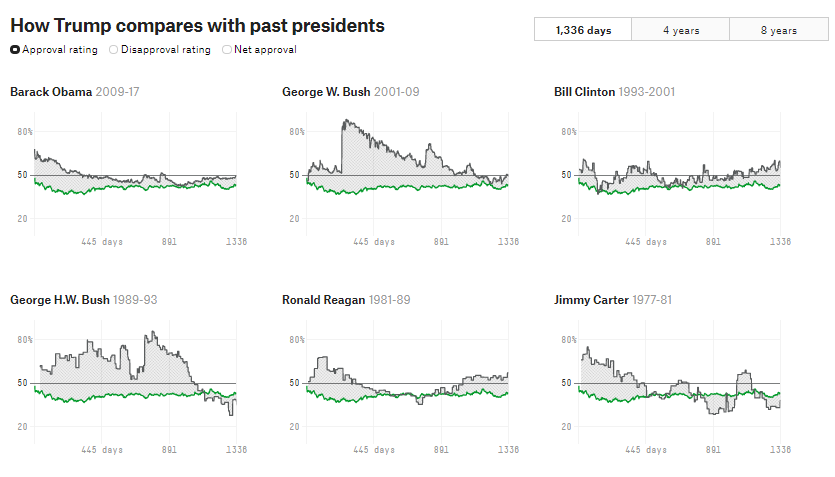 Even Obama’s full 8-years doesn’t show a ton of movement, which is interesting given that we did recover from the Great Recession during this period of time, had basic “peace and prosperity,” and there were no major scandals.