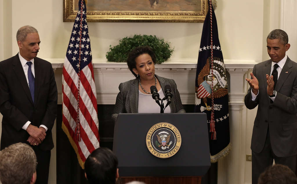 WASHINGTON, DC – NOVEMBER 08: Attorney General nominess Loretta Lynch (C) speaks after U.S. President Barack Obama (R) introduced here as his nominee to replace Eric Holder (L) during a ceremony in the Roosevelt Room of the White House November 8, 2014 in Washington, DC. Lynch has recently been the top U.S. prosecutor in Brooklyn, and would be the first African American woman to hold the position of Attorney General if confirmed. (Photo by Win McNamee/Getty Images)