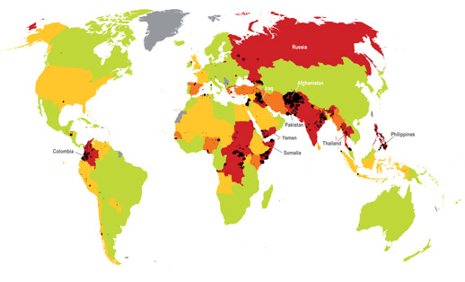 Terrorism risk assessment: Russia at "Extreme Risk", Greece at "High Risk", U. S. at "Medium Risk", Canada and Germany at "Low Risk".