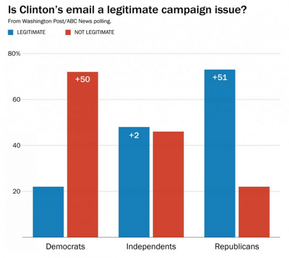 Bump’s point is best illustrated by referring to the charts accompanying his post, so here’s one that shows the partisan breakdown on a question asking if the email issue is a “legitimate campaign issue”: