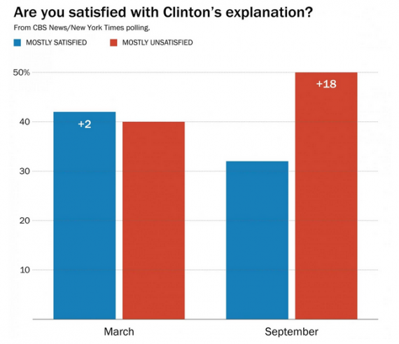 A second chart shows the response to a question from a September New York Times/CBS News poll asking voters if they were satisfied with Clinton’s response to questions regarding the issue: