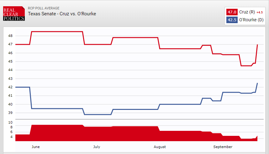 One of the most surprising races of the summer has been the match-up in Texas pitting Republican Senator Ted Cruz against Congressman Beto O’Rourke, who represents the area around El Paso in far-western Texas. Notwithstanding the fact that Texas has been a deeply red state for at least the past twenty-five years, the three-term Democratic Congressman has been running a very close race with the freshman Republican Senator. After O’Rourke won his party’s nomination, there was at least some indication that Cruz could be in for a real challenge in the form of polling that showed Cruz with only a three-point lead over the Congressman, which was within the poll’s margin of error. Polling taken about a month later, though, seemed to show that the initial bounce in O’Rourke’s favor had fizzled out and that Cruz was well-positioned to be comfortably re-elected notwithstanding the fact that national Democrats were pouring money into O’Rourke’s campaign. More recent polling, such as a poll taken just under a month ago, though, showed the race back to being a close race and an indication that Cruz could be in real trouble in a race that he should be winning easily.