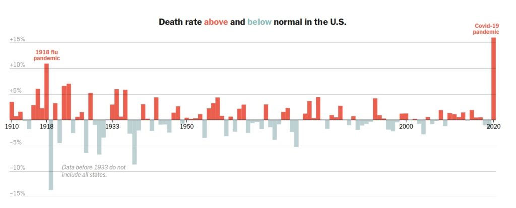 If we look at the 1918 flu pandemic, it killed 675,000 people in the US (6.5% of the population) according to the CDC. The current pandemic is 585,000 (1.7% of the population) and counting. So even with a smaller population and greater death toll, the 1918 flu pandemic shows about 11% increase in “normal death rate” compared to 16% increase in “normal death rate” of Covid-19.