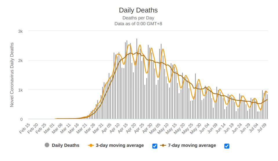 According to Worldometer, on July 6, the three-day moving average of death was 302 (granted, that was over a holiday weekend, which likely depressed reporting). Yesterday, July 10, the three-day average was 900.