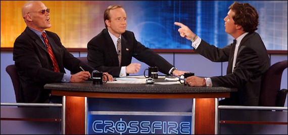 Now, in fairness to Klein, “Crossfire” had long since become stale by the time he pulled the plug. During its heyday, Kinsley and Pat Buchanan faced off with unconventional, incredibly smart debate. Neither of the posts were partisan hacks, which meant they weren’t always predictable, and both had a facility for conceding when the other side made a good point. But Bill Press and Bob Beckel and Paul Begala and James Carville were all in fact partisan hacks, and thus incredibly poor replacements for Kinsley. On the right, Bob Novak was a legendary columnist but he just came across as angry and contrived on television. Fred Barnes was too bland. And, while Carlson is divergent enough from the Republican mainstream as to be interesting, he was no Pat Buchanan.