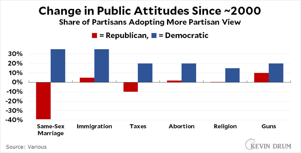 Despite endless hopeful invocations of “but polls show that people like our positions,” the truth is that the Democratic Party has been pulled far enough left that even lots of non-crazy people find us just plain scary—something that Fox News takes vigorous advantage of. From an electoral point of view, the story here is consistent: Democrats have stoked the culture wars by getting more extreme on social issues and Republicans have used this to successfully cleave away a segment of both the non-college white vote and, more recently, the non-college nonwhite vote.