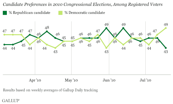 The Democrats’ six-point advantage in Gallup Daily interviewing from July 12-18 represents the first statistically significant lead for that party’s candidates since Gallup began weekly tracking of this measure in March.