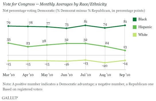 According to Gallup, since March, support for Democrats among whites and African-Americans has remained almost unchanged, but among Hispanics support for Congressional Democrats has been imploding. In March, Hispanics supported Democrats by a 33-point margin; that has dropped to only a 13-point margin today.