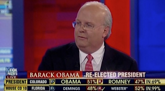 Perhaps the most amusing moments of election return watching for me last night came after all the networks had called both Ohio and the Presidential Election as a whole and I decided to switch over to Fox News Channel to see how they were handling the news. I would’ve done the same thing with MSNBC had Romney won because, well, it was late at night and schaudenfreude is just so much fun sometimes. What I wandered into was a five minute rant from Karl Rove trying to explain why the network that pays him was wrong to call Ohio and the race for the President: