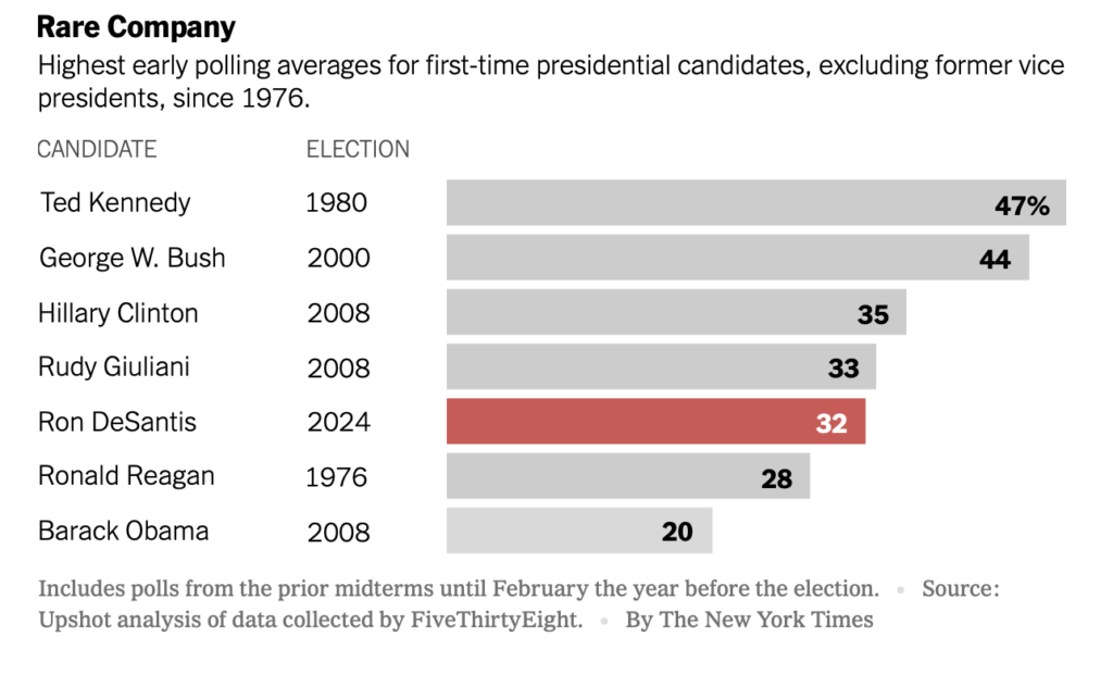 Cohn correctly notes that, at a minimum, DeSantis faces far fewer challengers than did Walker, and that his relative popularity at this stage of the game suggests a much better position than Walker had at this time. Although I do think there are some analogs as both built national brands via Fox News by using their offices in similar fashions.