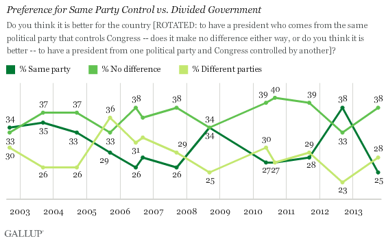 It’s worth noting, of course, that the largest number of respondent right now are of the opinion that it makes no difference whether we have divided government or one-party control. While I don’t have access to poll internals, I’d suggest that this is largely a reflection of the fact that public trust in government as a whole is at all time lows at the moment. Therefore, the cynical position is to simply say that it really doesn’t matter whose in charge. It’s also interesting to note the spike in respondents in support of one-party control that seems to have happened shortly after the 2012 elections. The fact that it dropped off so quickly suggests that this was little more than post-election euphoria among people who supported Barack Obama in that election.