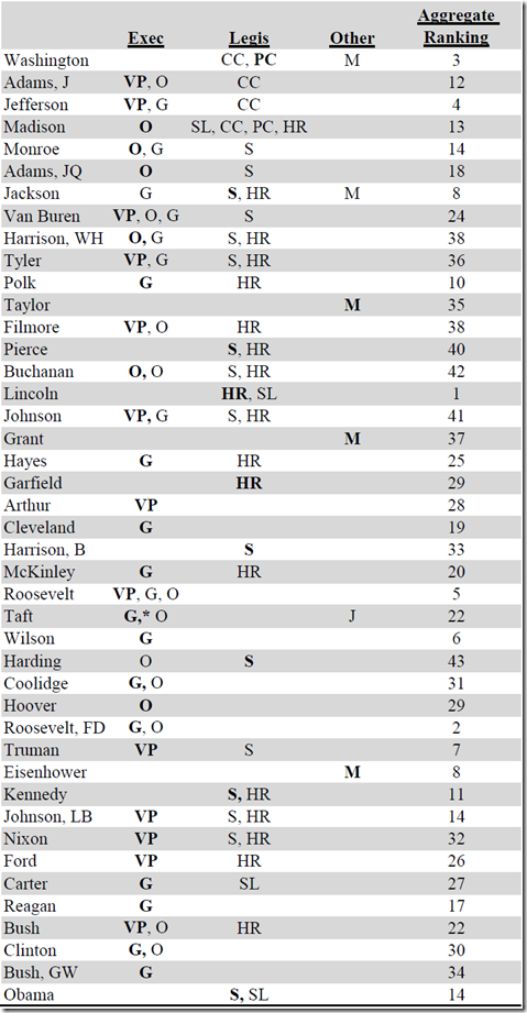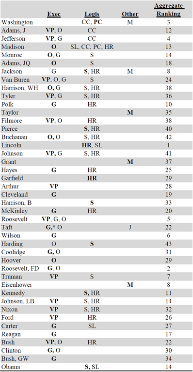 In conclusion, I would argue that an actual examination of the career paths of presidents provide no compelling evidence to suggest that a specific experience with executive or legislative office equates to explaining the quality of a given presidency.