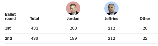 There were two Republicans who voted for someone “other” on the first round but voted for Jordan on the second round, and another who appears to have been absent round 1 and voted for Jordan in round 2. There were four who voted for Jordan on the first round but voted for someone “other” on the second round.