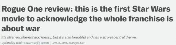 The title of Vox’s review of Rogue One, the new Star Wars movie that tells the story of how the Rebels got the plans for the first Death Star that was destroyed in the original movie released back in 1977, is perhaps the dumbest headline I’ve ever seen: