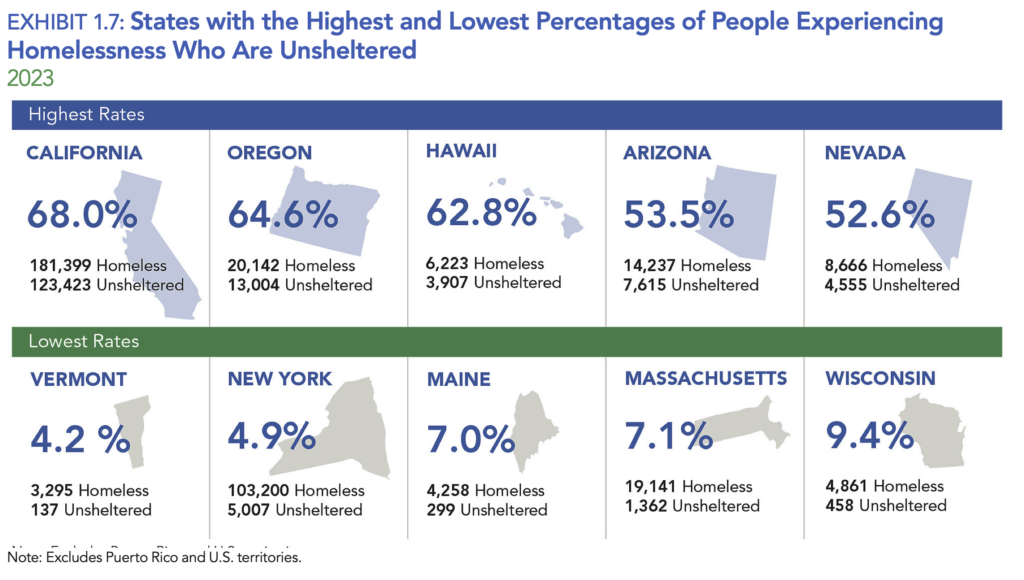 The two states with the highest rates of unsheltered homelessness are California and Oregon. The three states with the lowest rates of unsheltered homelessness are all blue ones in the Northeast: Vermont, New York and Maine.