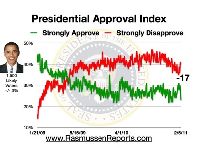 The Rasmussen Reports daily Presidential Tracking Poll for Saturday shows that 23% of the nation’s voters Strongly Approve of the way that Barack Obama is performing his role as president. Forty percent (40%) Strongly Disapprove, giving Obama a Presidential Approval Index rating of -17 (see trends).