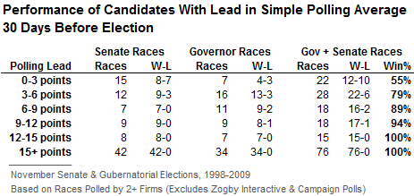 I have a database containing almost all polls conducted in all U.S. Senate and gubernatorial races since 1998. I say almost all because it excludes internal polls released by campaigns and other explicitly partisan groups, and it excludes Internet polls conducted by Zogby Interactive, which in my view are not scientific. My database also does not include polls for irregularly-scheduled special elections, like the one in Massachusetts earlier this year — only contests in November.
