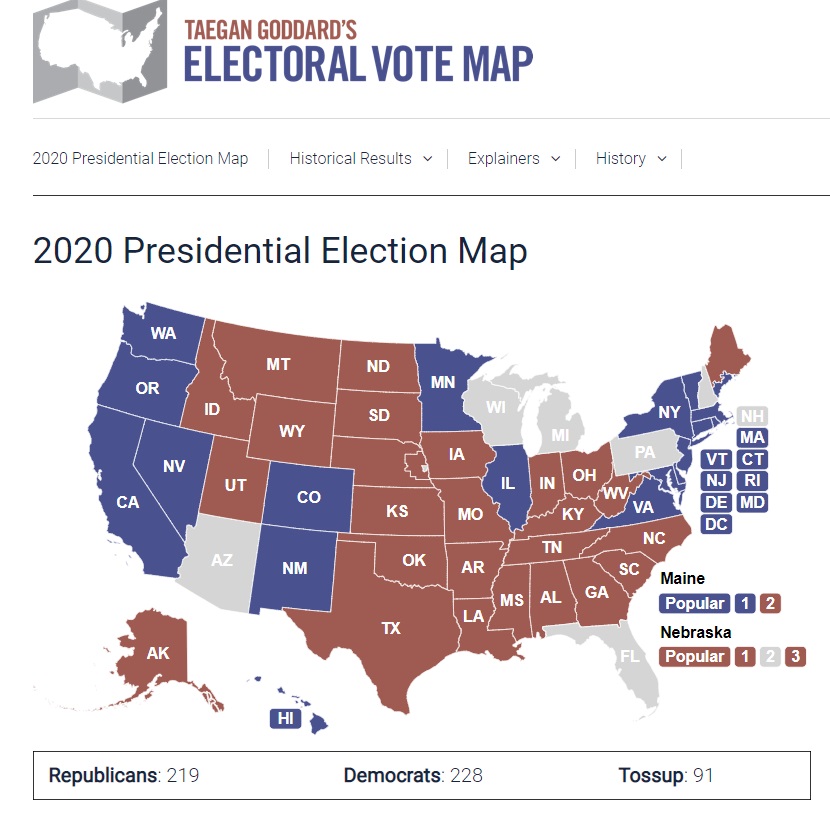 In terms of the EVM vs 270toWin, it depends on how you want to use it. I prefer EVM’s starting point, as averages of respected polls and predictions are almost certainly better than any single one. (I’d recommend adding in the RealClearPolitics average unless they’ve made it proprietary.) But 270toWin’s “Winning Combinations” feature is quite valuable.