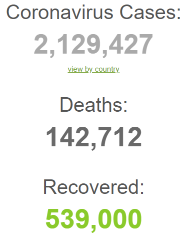 What I don’t understand is the mortality rate estimates that have been thrown out. WHO, based on China’s experience estimated 3.4%. Others, I’ve seen 1.2%. Just looking at the numbers today. Even if everyone who tested positive today recovered that would leave us 6.7% (142308/2145511) world wide or 33903/667572 or 5.1% US. So unless there are huge batches of infection that will be undetected, I don’t see how you are going to get low mortality rates. Granted I may be thinking about this all wrong. If I can be corrected, please do so.