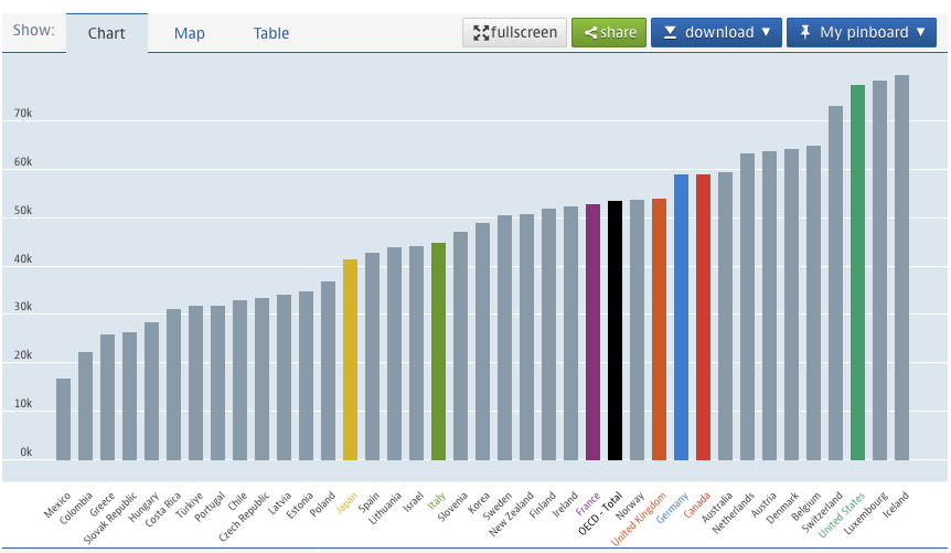 It’s noteworthy, too, that some of the richer countries are excluded. Here’s the chart presented atop the OECD average wage page: