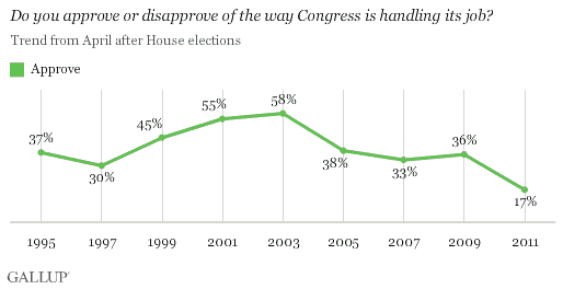 Congress’ approval rose slightly in January and February as the new 112th Congress took office, before dropping back in March. This is a typical pattern, which was also evident after a new party took control of the House in 1995 and 2007. In both of those years, congressional approval rose in the initial months of the new Congress, and then settled back down, as it has this year.