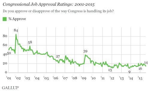 This isn’t exactly news, of course. For years now, public opinion regarding Congress has been at exceedingly low levels. Gallup’s measurement of public approval of Congress had already dropped to 13% as far back as 2010, and took a short jump up to 21% in 2012 in advance of the elections only to fall back to 14% shortly before President Obama was inaugurated for his second term. Things got really bad in the aftermath of the 2013 government shutdown and the failure of the Obamacare exchange website when Congressional job approval dropped to 11%, and then down to a record low 9% in November 2013. A separate around that same time found Congressional job approval at 6%. So basically, what we’re seeing here is really just a continuation of the same trend that seems to have began in the middle part of the first decade of the century, when the national consensus after the September 11th attacks began to melt away: