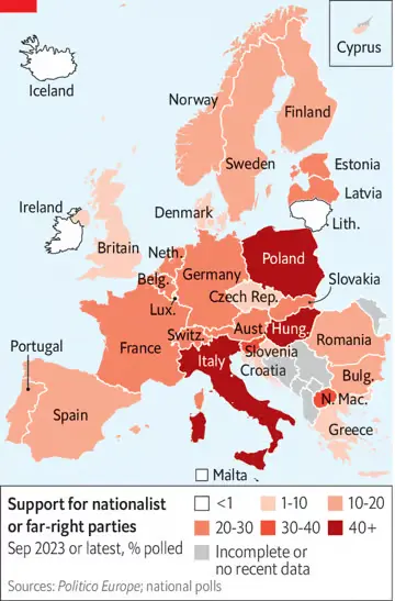 Nonetheless, the trend is alarming, for three reasons. First, it is remarkably broad. Four of the five most populous countries in the European Union have hard-right parties either in government or polling above 20% (see map). Second, the current circumstances are especially propitious for populist parties, with immigration rising after a hiatus during the pandemic, inflation high and the growing cost of climate policy creating a potent new focus for popular ire. Third, and most important, the hard right does not need to win power to have a baleful impact on politics. Simply by attracting a big share of voters, it is already skewing the debate, and so making it harder for European governments to adopt sensible policies on pressing problems, such as the war in Ukraine, immigration and climate change.