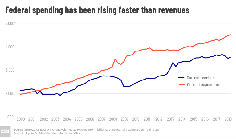 The federal deficit rose 17% in 2018, to $779 billion — the highest since 2012, thanks to a bigger military budget, rising interest costs, and a giant tax cut.