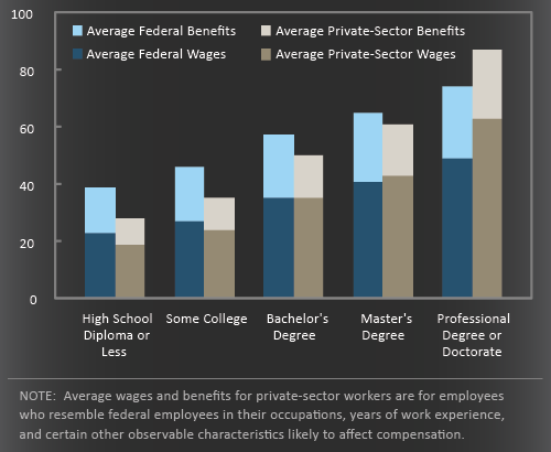 - Federal civilian employees with no more than a high school education averaged 36 percent higher total compensation than similar private-sector employees.