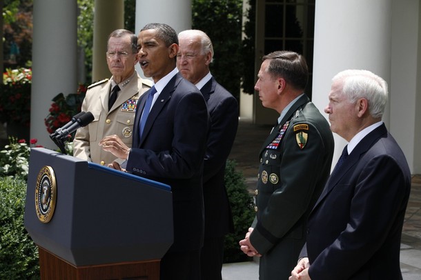 U.S. President Barack Obama delivers a statement in the Rose Garden of the White House in Washington, June 23, 2010, where he announced that General Stanley McChrystal has been relieved of duty as top war commander in Afghanistan and replaced with General David Petraeus (2nd R). Also with Obama are (L-R) Chairman of the Joint Chiefs of Staff Mike Mullen, U.S. Vice President Joe Biden, and Secretary of Defense Robert Gates. REUTERS/Jason Reed (UNITED STATES – Tags: POLITICS)