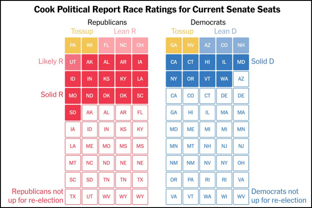 Kevin Drum points to a story I saw a couple of days ago but didn’t get around to blogging, a NYT report titled “With Control of the Senate in Play, These Are the Races to Watch,” which is itself based on the latest Cook Political Report Race Ratings.