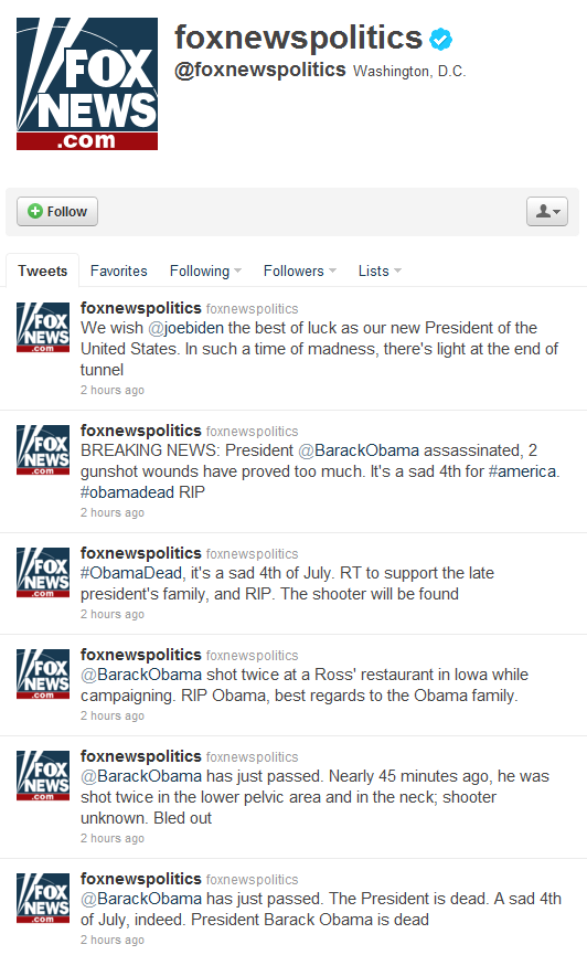 The @foxnewspolitics feed stated: “BREAKING NEWS: @BarackObama assassinated, 2 gunshot wounds have proved too much.”