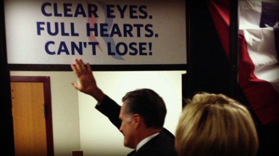 Romney has used the “Clear Eyes” phrase — which originated as a rallying cry for the high school football team on the FNL television series — in several campaign speeches, and it appears on his Facebook page. The Republican presidential nominee and his wife, Ann, are fans of the series, which ended its five-year run on NBC and DirecTV last year. Romney said in Iowa earlier this week that the phrase is “compelling.” “That’s Americans,” he told an audience. “We have clear eyes — we know what we believe. Full hearts — we love this country and we can’t lose. This is a time for Americans to make a choice. We’re going to take back this country.”