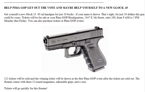 The local party sent out its e-newsletter late last week advertising the raffle. On the third page of the seven-page document, a large illustration of the gun appears with the headline “Help Pima GOP get out the vote and maybe help yourself to a new Glock .40.“