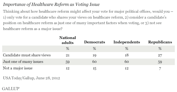 Most importantly, though, 20% of voters say that they would base their vote on a candidates position on health care reform: