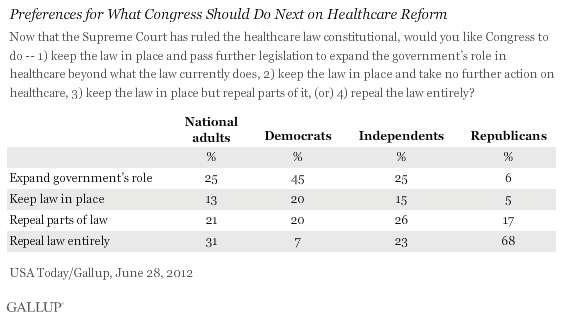 This reaction, from a USA Today/Gallup poll conducted June 28, is consistent with Gallup polling on the 2012 Patient Protection and Affordable Care Act earlier this year, which showed roughly equal percentages of Americans calling congressional passage of the act a good thing vs. a bad thing.