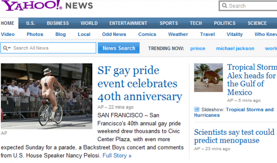So, the top story on YahooNews this morning is “SF gay pride event celebrates 40th anniversary.” Again, slow news day. But let’s just say that it wasn’t the headline that caught my eye, but rather the sight of some middle aged dude’s bare ass used to illustrate the story.