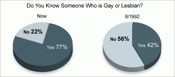 This isn’t remotely surprising. But I would suggest that the direction of the causality isn’t clear. As homosexuality has become more accepted — through exposure in the pop culture, mostly — gays and lesbians have been more apt to live openly, at least among their friends and loved ones. And that, in turn, has meant that more of us know gays and lesbians as ordinary folks with different sexual proclivities rather than as bogeymen or the flamboyant “lifestyle” types that dominated media coverage a couple decades ago.