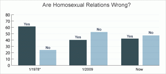 The increasing visibility of gay and lesbian Americans appears to have contributed toward more positive perceptions of homosexual relations. Forty-three percent of Americans currently see homosexual relations between consenting adults as “wrong” – a drop of 19 percentage points from a Gallup poll taken in 1978.