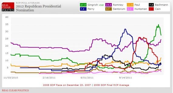 At the very least this means that the negative campaigning is likely to continue right through the end of the year, because by all measures it’s been working. Of course, it’s worth noting that national polling doesn’t mean as much as state polling at this point, but it does give us an idea of where the momentum is, and right now Newt Gingrich has downward momentum while Mitt Romey is moving up: