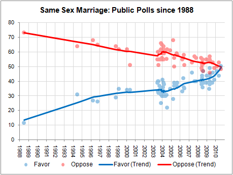 On a related note, Nate Silver notes this morning that public opinion on same-sex marriage seems to be changing far faster than anyone anticipated, and in support provides this chart showing polling trends on the same-sex marriage question going back to 1988: