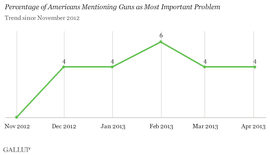 Clearly, the post-Newtown focus on this issue did increase its importance in the eyes of voters to some degree, but not by much. Even at the height of the post-Newtown political push, only 6% of Americans considered gun control the most important problem facing the nation. That’s a far cry from the vast majority of voters who say that they support the various gun control measures that have been advocated over the past four months.