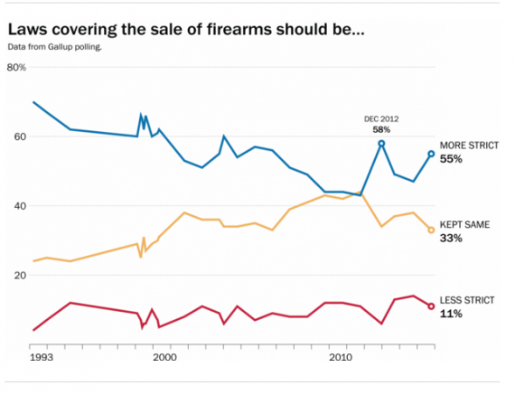 Support for stricter laws just jumped to 55 percent, according to Gallup, while the percentage of people thinking they should be kept as they are has dropped to 33 percent. An additional 11 percent want less-strict laws.
