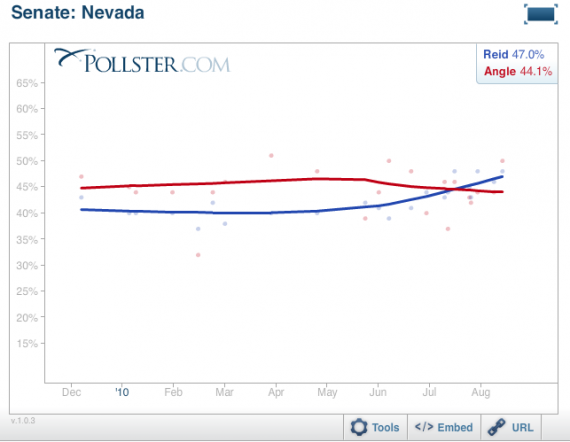 So far at least, Reid has seemed to succeed in his effort to knock Angle down, but the polls remain close: