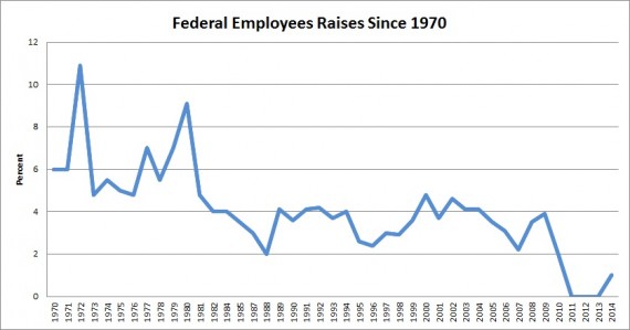 You’ll notice that the peaks and valleys roughly correspond to the federal pay raises. Raises were very high in the 1970s and early 1980s because of sky-high inflation; they’ve been much lower since because there’s been next to no inflation. Owing to the Great Recession, we actually had negative inflation in 2009. Federal employees nonetheless got a pay raise in 2010.