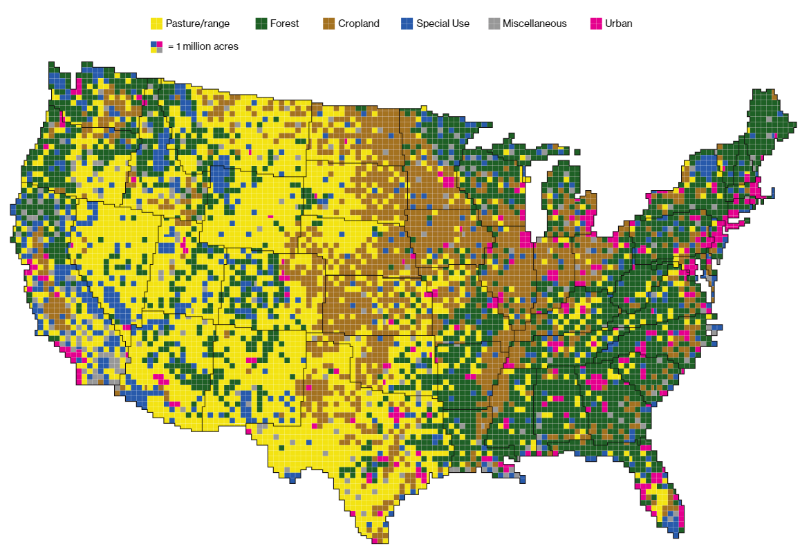 I stumbled on this July 2018 interactive feature titled “Here’s How America Uses Its Land” while perusing Bloomberg. The baseline map of the contiguous 48 states by itself is quite interesting: