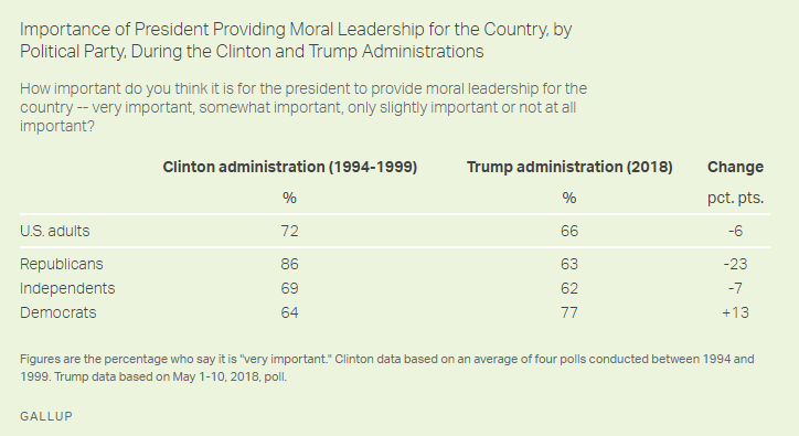 This turning of the tables is evident in the flip in Republican and Democratic views about the importance of the president providing a good moral role model between the Clinton and Trump eras. Republicans, by 22 points, were much more likely than Democrats to say it was very important for the president to be a moral leader when Clinton was in office. Now with Trump in office, Democrats are more likely than Republicans to hold this view, by 14 points.