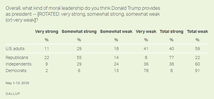 Twenty-two percent of Republicans think Donald Trump provides somewhat or very weak moral leadership as President, according to a Gallup poll released Tuesday. Fifty-nine percent of Americans say the same, with 60% of independents and 91% of Democrats agreeing.