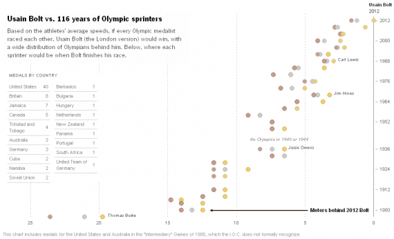 Jamaica’s Usain Bolt defended his gold medal in the 100 meter dash, breaking his own Olympic record. The NYT has a graphic showing how far behind previous Olympic medal performances would be: